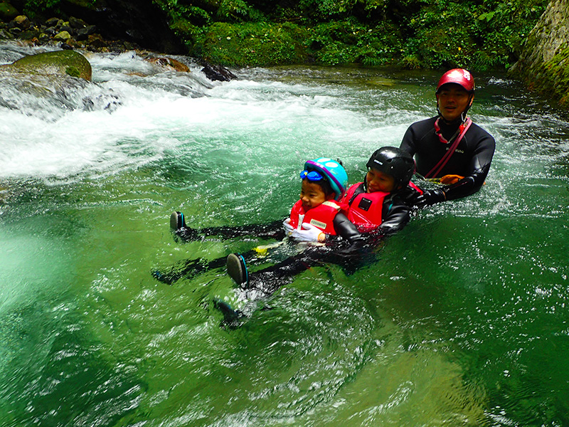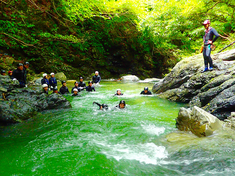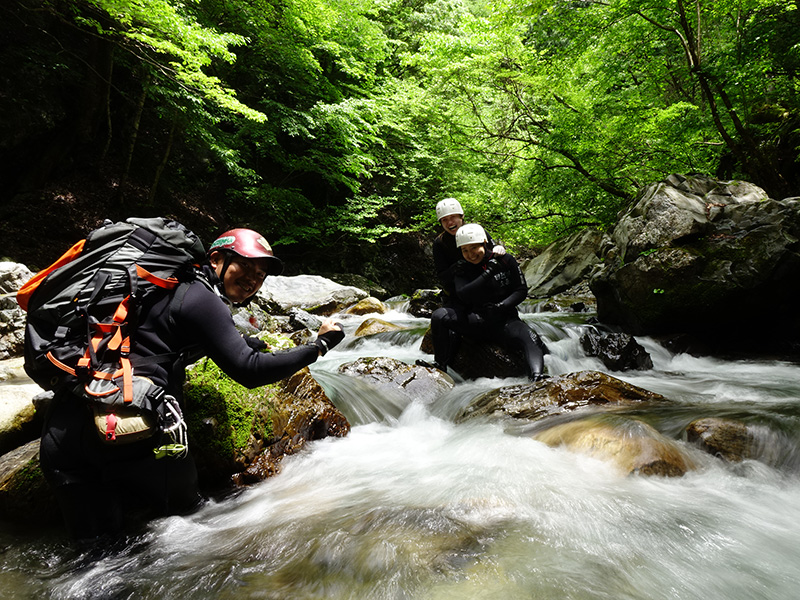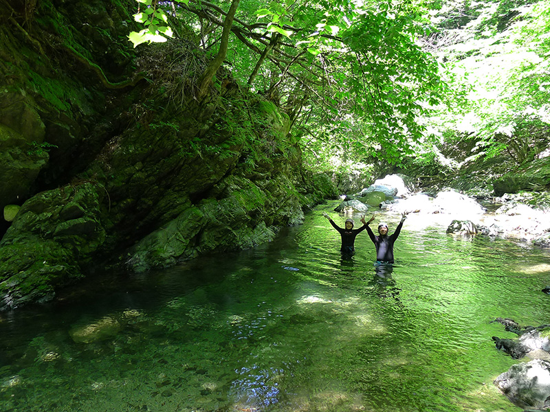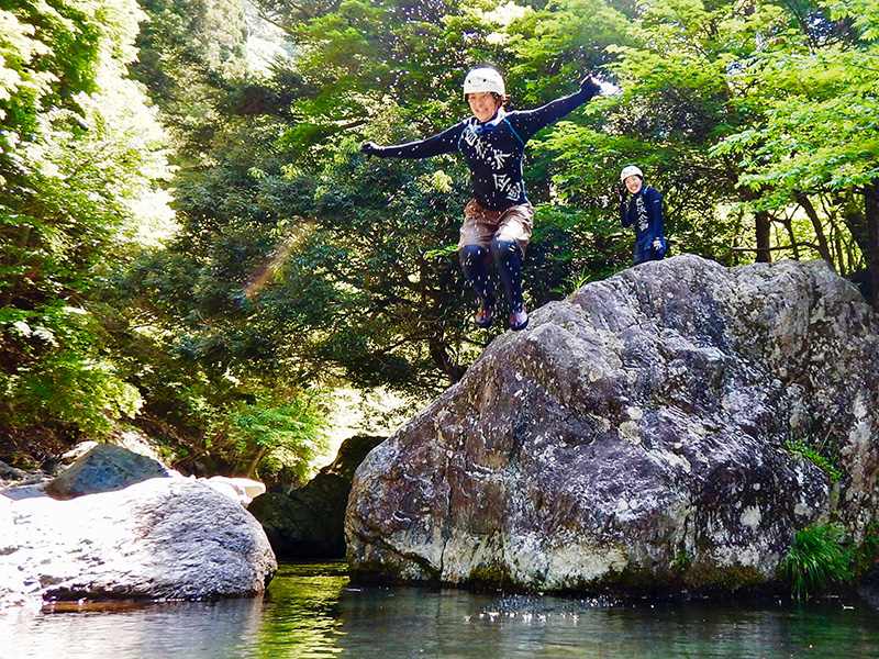 数あるコースの中でも、最もお安い料金設定で、自然派企画のツアーに初めて来られる方にお勧めです。 小学一年生からご参加可能です。 コースの中に小滝や天然のプールなどが点在し、水泳から飛び込みまで満喫できます。レベル1だからといって、大人でも満足できる内容です!子供向けということではありません。 飛び込みは、自由参加です。 明王谷にはウォータースライダーはありませんので、試さないで下さいね!