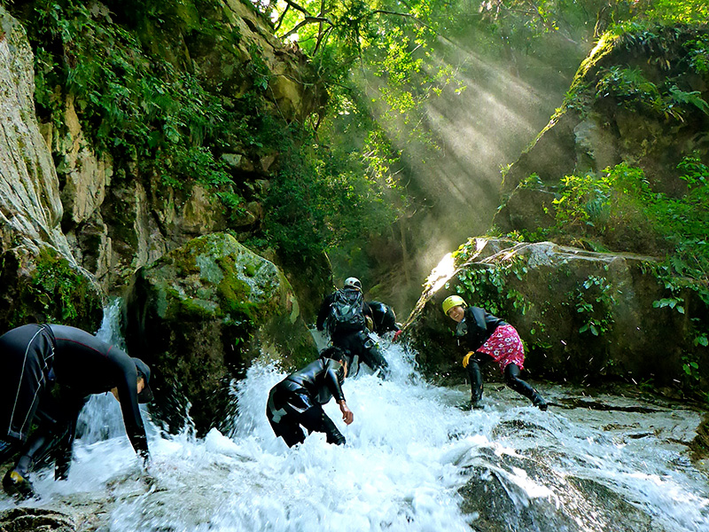 八ツ淵の滝は、日本の滝100選にも選出されている美しい滝群。その名のとおり「魚止」「障子」「唐戸」「大擂鉢」「小擂鉢」「屏風」「貴船」「七遍返し」という8つの滝があり、知られざる滝群も含めシャワークライミングで巡ります。それぞれの魅力を楽しみながら進みましょう!